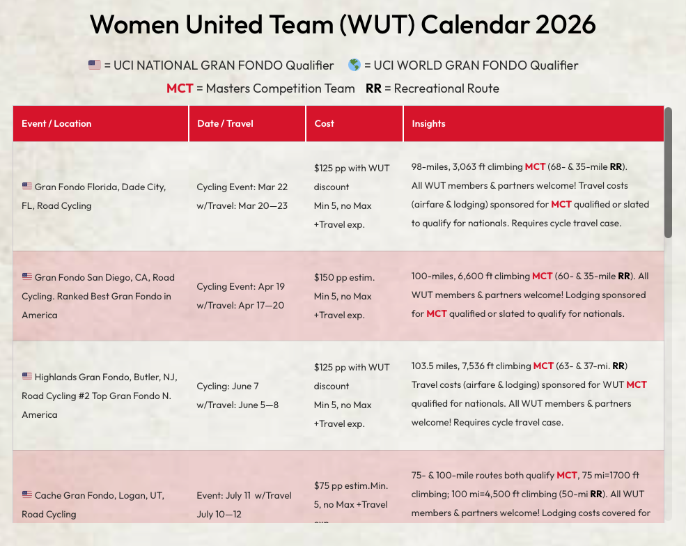 Women United Team required a detailed public calendar that displays race events, qualification indicators, and team planning information. A fully built customizable calendar was created with icons for qualification levels, sticky headers, and a responsive design. The result is a clear, polished, and easy to navigate event reference for team members and supporters. See it in action and the custom site built for them at https://womenunited.team.